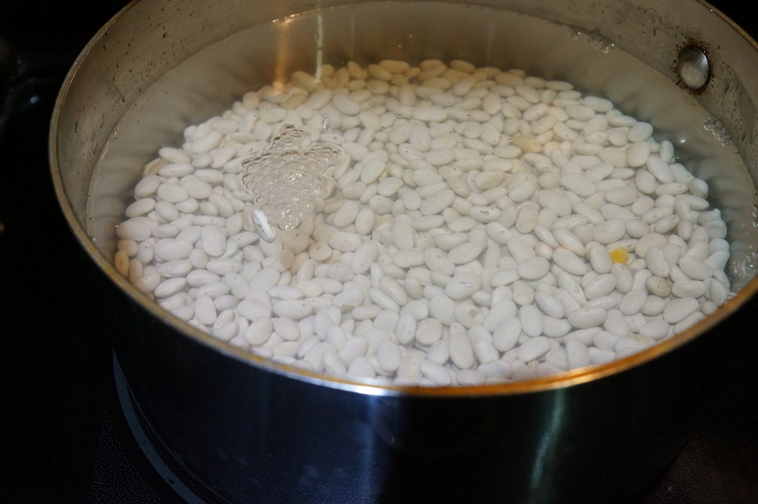 Dried beans are a great base for soups, but they take some time to soak before cooking. Put them in a pot with plenty of water; there should be at least three inches of water above the beans. You can let them soak overnight, or do a “quick soak” by bringing them to a boil for two minutes, then cover and let sit for an hour. Regardless of how you soak the beans, discard the water and rinse the beans before proceeding.